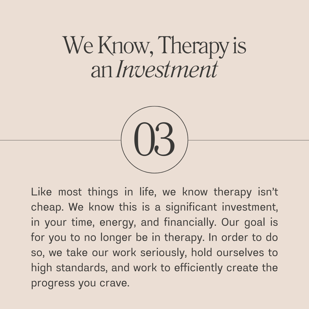 Like most things in life, we know therapy isn’t cheap. We know this is a significant investment, in your time, energy, and financially. Our goal is for you to no longer be in therapy. In order to do so, we take our work seriously, hold ourselves to high standards, and work to efficiently create the progress you crave.