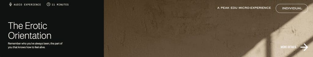 I invite you to explore our new micro-experience, The Erotic Orientation. Through story, reflection, and guidance, Jennifer Keilholtz and I begin to usher you back into aliveness in this micro-experience. We’re not talking about treating clinical depression here. We’re talking about that “Big Gray” feeling that hovers over a life full of responsibilities, to-dos, screens, and worries. We’re helping you find the trailhead, the beginning of a path you crave to walk, and you don’t have to walk it alone.